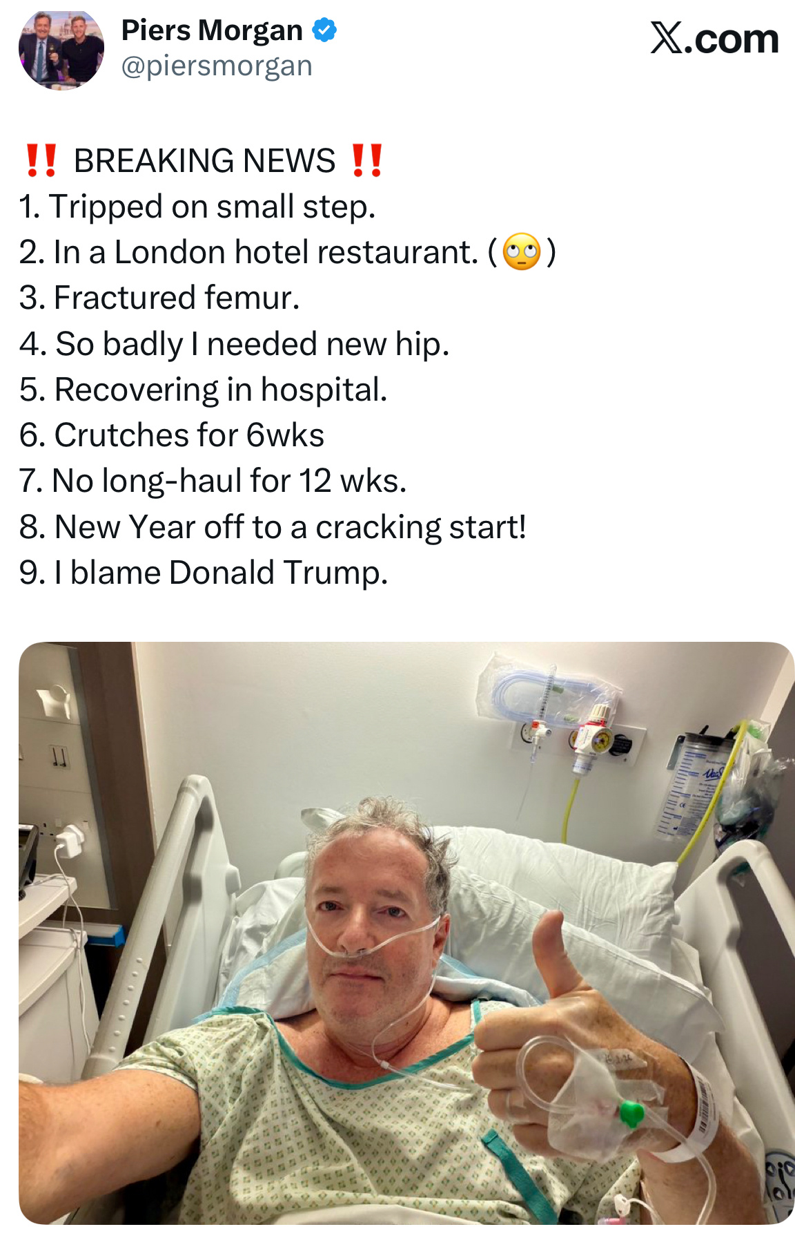 The older anybody is, the more risk of a fall resulting in a fracture (the hip/femur being one of the most common). Piers is actually relatively young! Last thing: and I’m not sure whether it was involved here, but always be extra careful if you are out and consume alcohol. The amount of falls and fractures I see where excessive alcohol is involved, is pretty common.