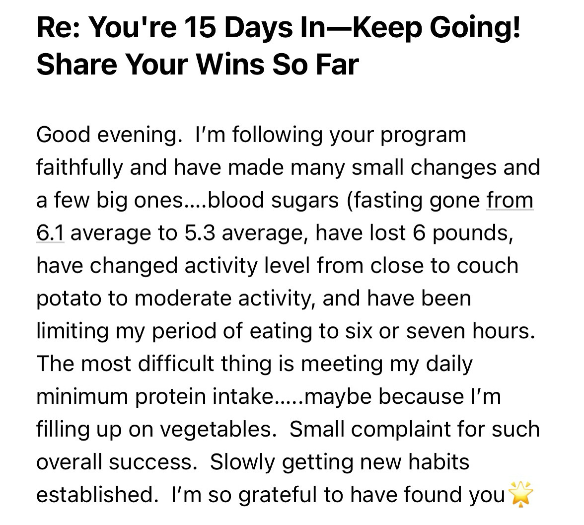 This was the feedback I got from a lady 15 days into my MetThrive Method Natural Fat Loss and Insulin Resistance Reversal Program.